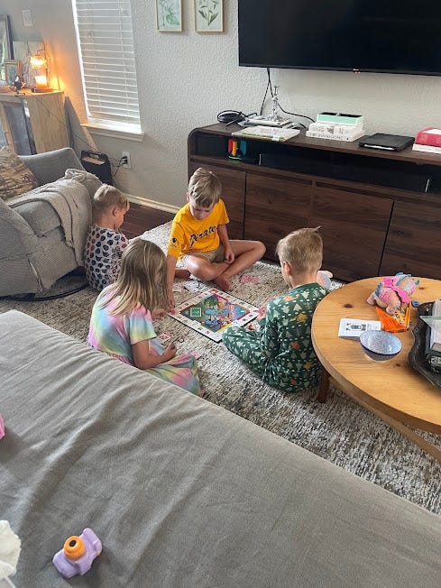 A lot of togetherness. Since we only know a few people down here, the five of us have been with each other all day long. More togetherness means more bickering and conflict, which I’ve accepted as a part of asking everyone to be a unit all of the time. One of my favorite parts of having them in school is that they get the chance to be with their same-aged peers, and that it allows them to temporarily break out of the role and place they have in our family. I can tell that one kid in particular is struggling with constantly being with their siblings, and in hindsight, I’d do better about creating 1:1 times with each of them. Also, implementing a separate quiet time so that they have the chance to have their own activities without interference from a brother or sister.